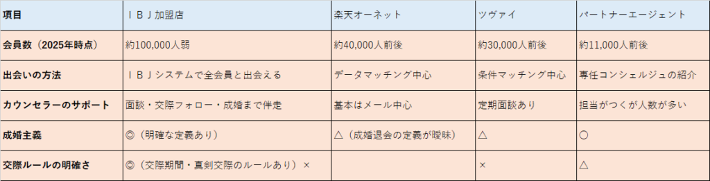 この表からも分かる通り、IBJは「出会いの数」・「」・「サポートの手厚さ」において、他社を大きく上回るサービス設計となっています。