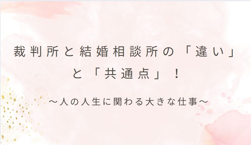 「裁判所」は、法律や判例を基準に、形式的に中立・公平に判断する機関です。一方、結婚総暗所は、人の気持ちに寄り添い、感情を重視し、一緒に伴走するサポート役です。一見真逆の仕事のように思えますが、実はとても多くの共通点がありました。